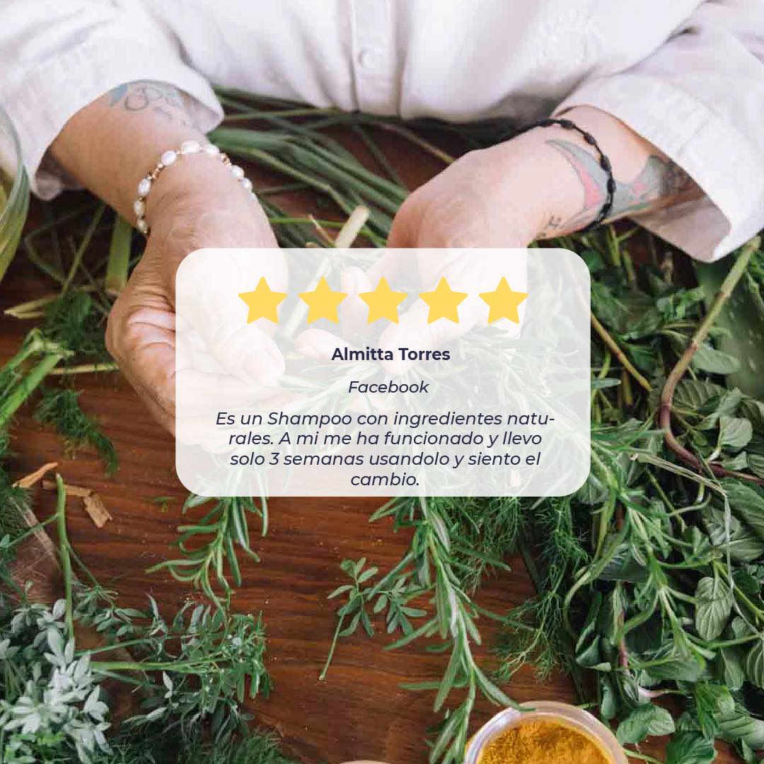 Despídete de la caída y del cabello sin vida. Este shampoo artesanal combina romero, manzanilla, salvia y más de 15 hierbas que limpian profundamente, fortalecen desde la raíz y devuelven el brillo natural a tu cabello.